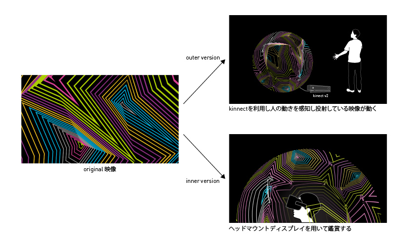 ひとつの映像を異なるデバイスに出力することにより、違う視点で作品を鑑賞することができます。 今回の作品は全天球を内から見るか、外から見るかのふたつの見え方になることを想定して制作しました。